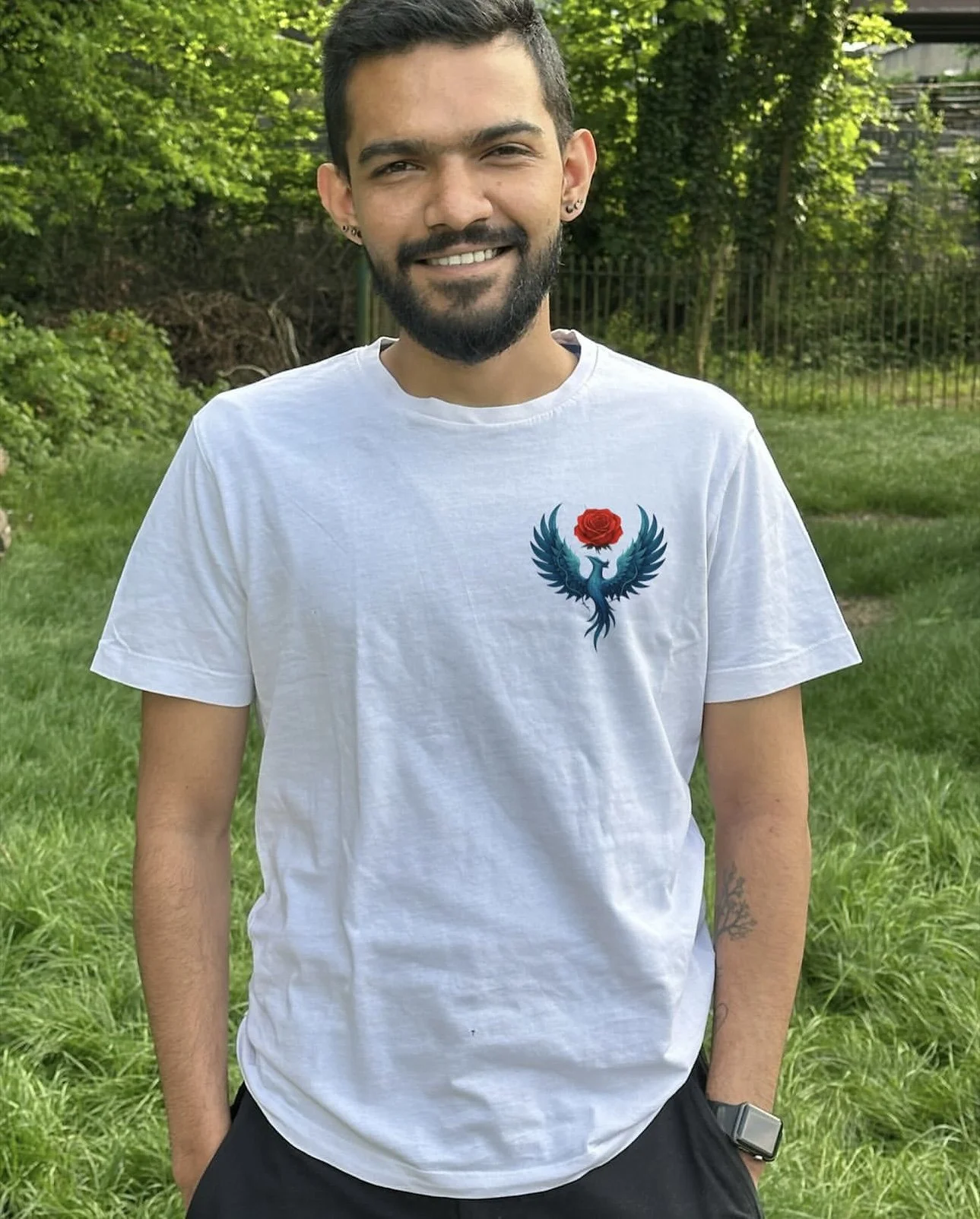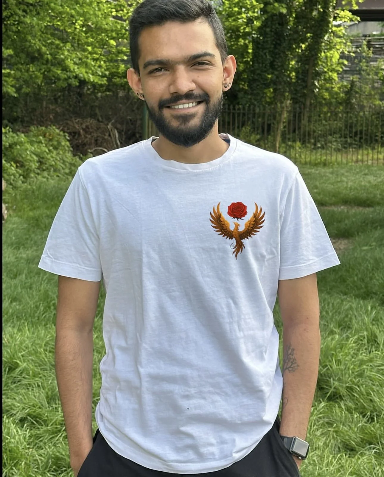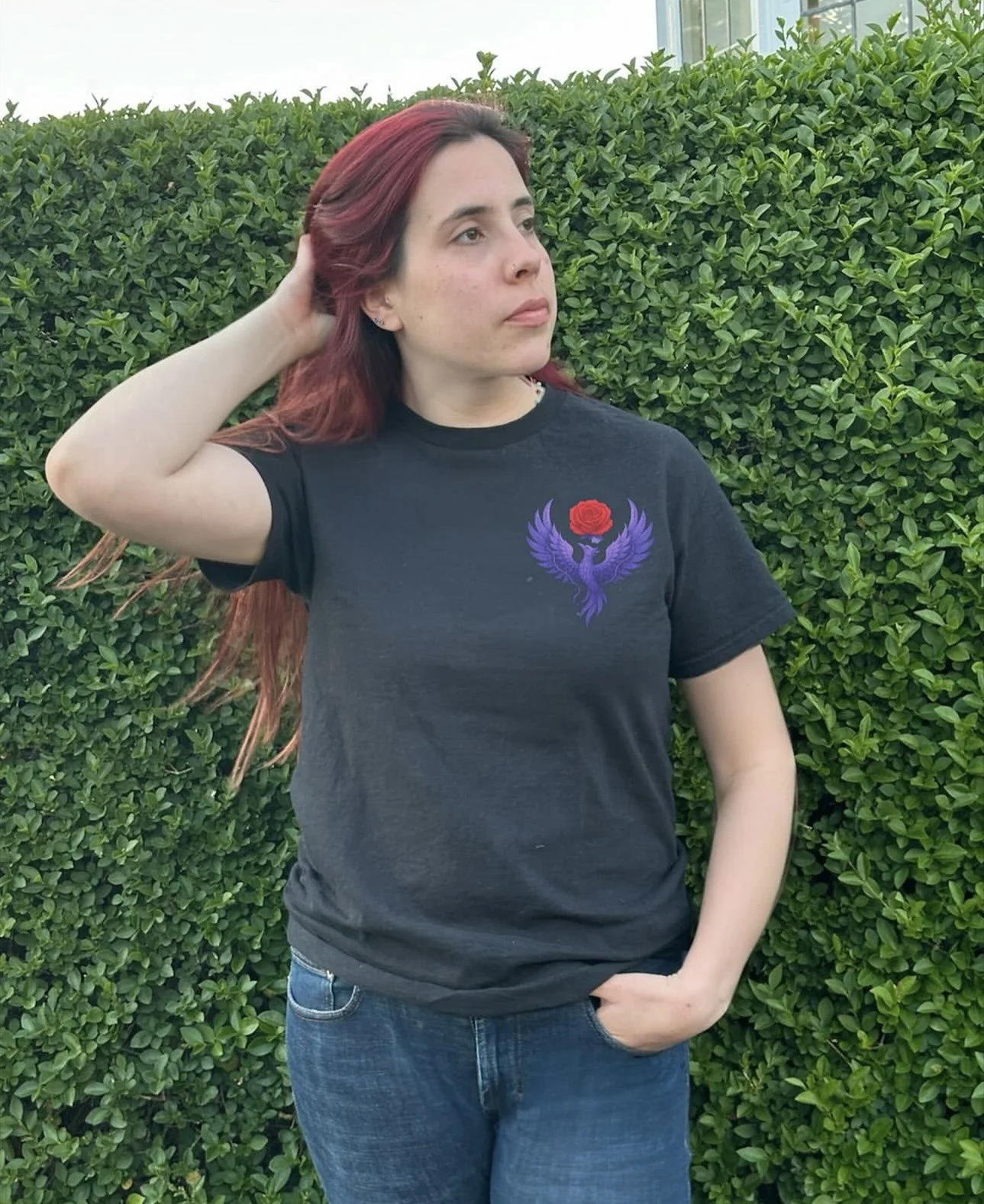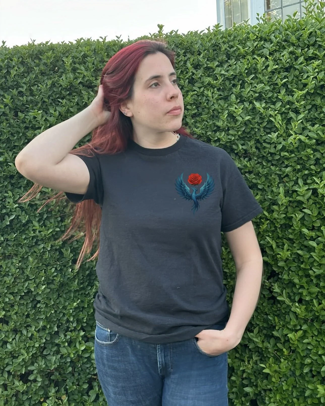 Wrapped in comfort, this t-shirt blooms with quiet strength. A rose rises at the heart, lifted by wings of resilience a symbol of growth, memory, and becoming. Wear it as ease, wear it as armour, wear it as a reminder that even through struggle, beauty takes flight.