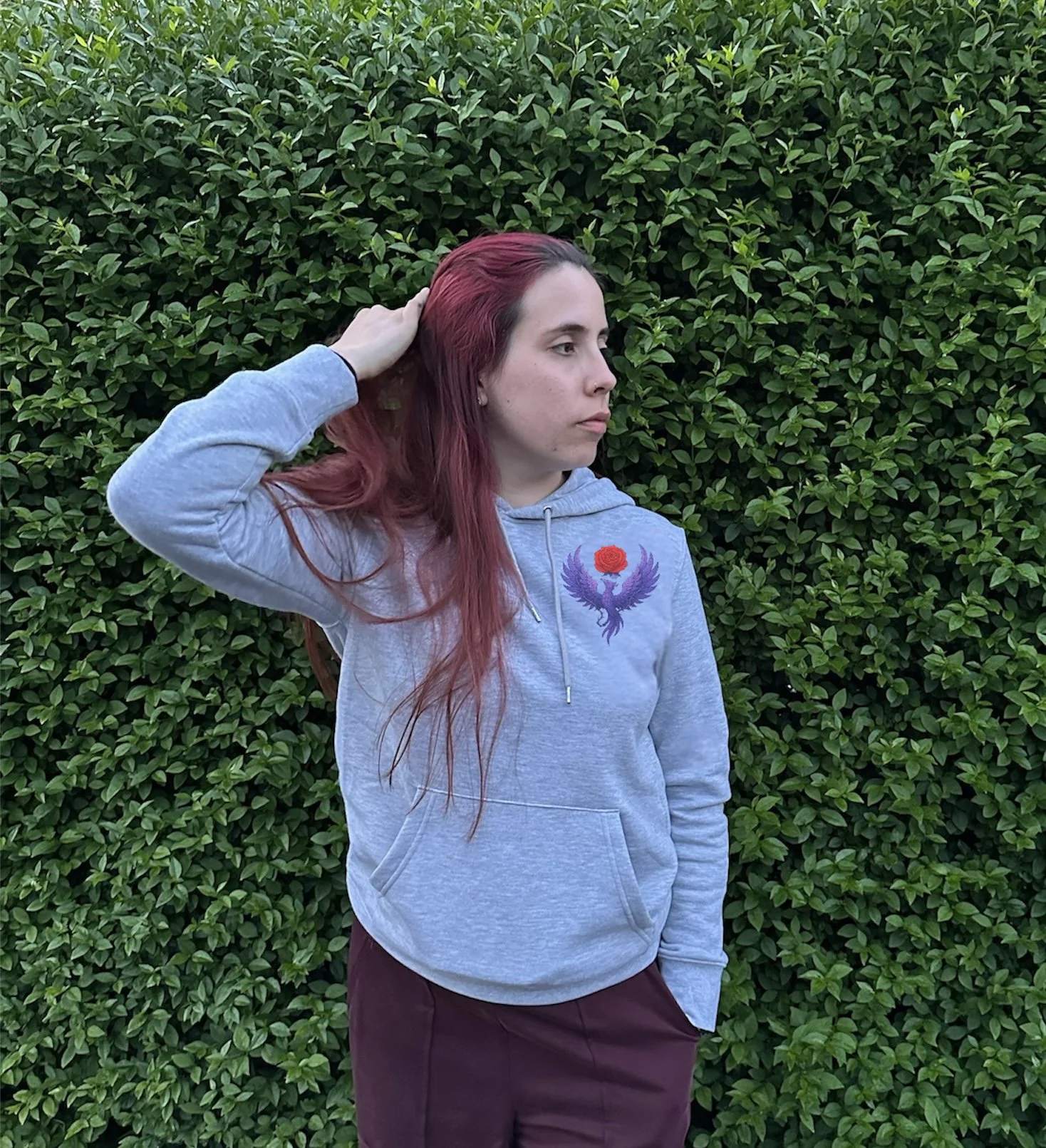 Wrapped in comfort, this hoodie blooms with quiet strength. A rose rises at the heart, lifted by wings of resilience a symbol of growth, memory, and becoming. Wear it as warmth, wear it as armor, wear it as a reminder that even through struggle, beauty takes flight.